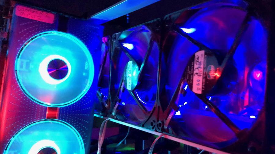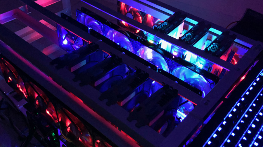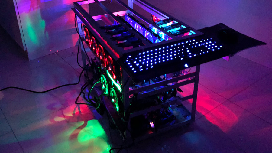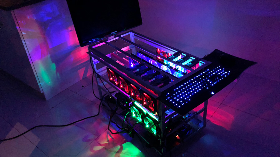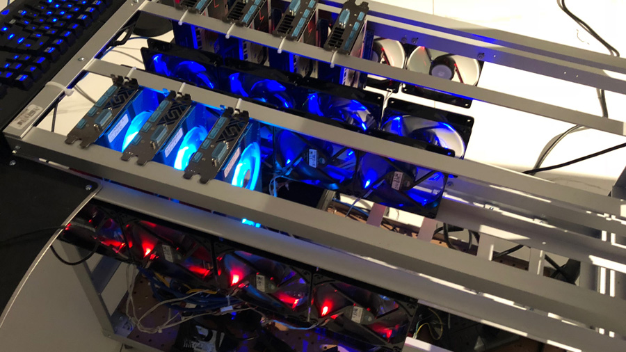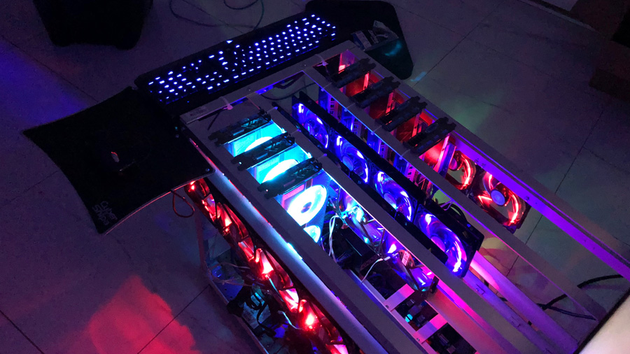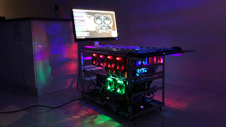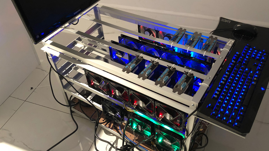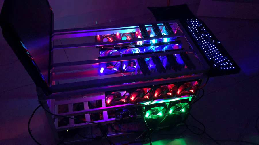 This is an Etherium mining rig. This rig once completed will mine at 800-950 MH/s. Currently, it is mining at 250MH/s. The frame is a custom build that can hold up to 20 GPUs. It has an internal and external custom cooling system.